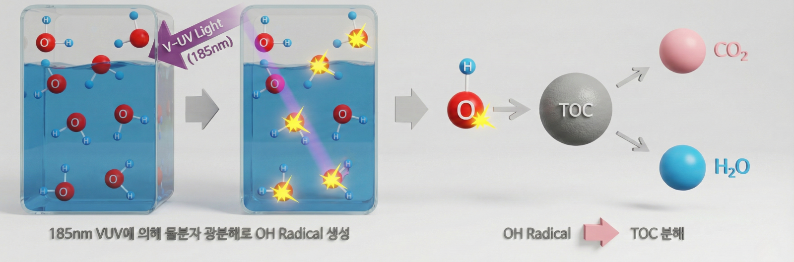 진공 자외선을 이용한 광분해는 산화제를 첨가하지 않고 물속에서 고농도의 하이드록실 라디칼을 생성할 수 있는 간단하고 가장 깨끗한 방법으로 주로 UPW(Ultra Pure Water) 생산 공정에서 TOC를 제거하기 위해 이용됩니다.