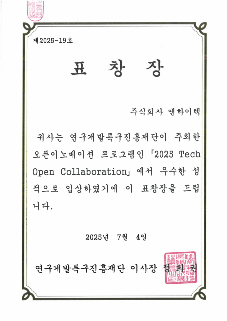 ㈜엔하이텍(ENhitech)은 2025 Tech Open Collaboration 프로그램에서 제안 기술이 우수기술로 선정되어 우수상을 수상하고, 동시에 연구개발특구진흥재단 표창장을 수여받았다고 밝혔다.